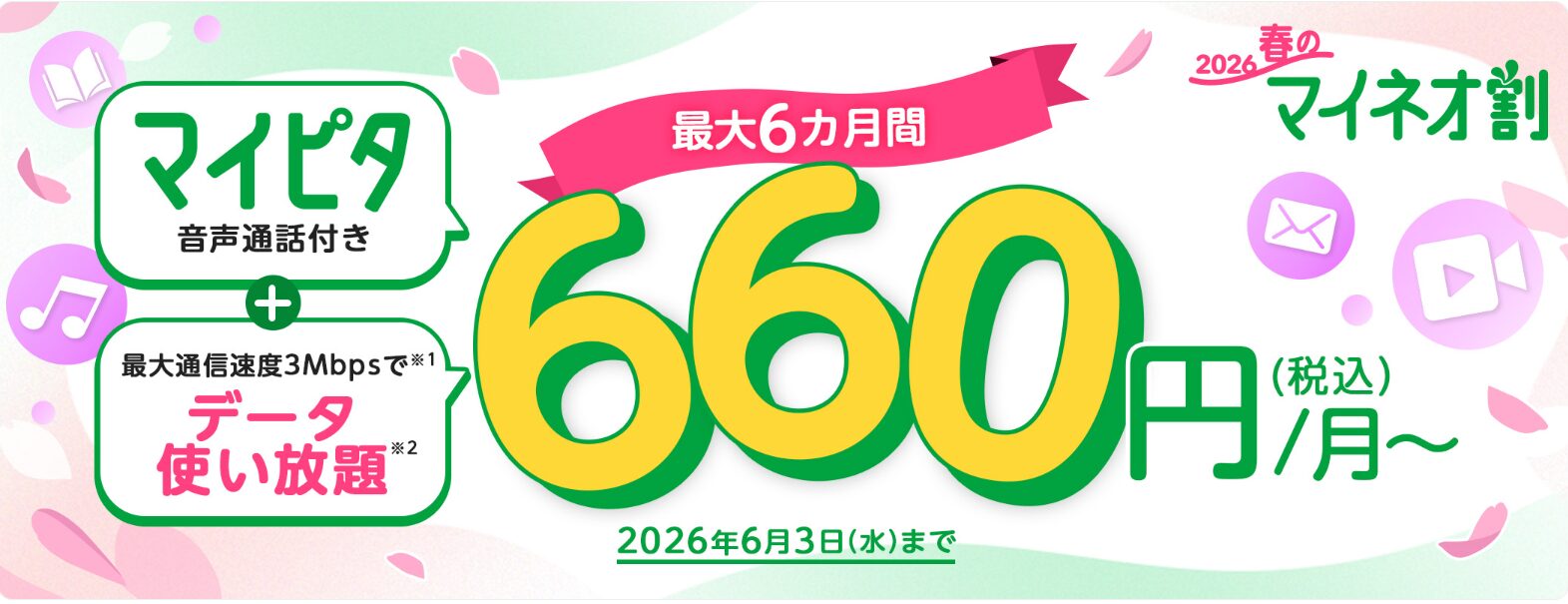 - 📌 春のマイネオ割:最大6ヶ月間、月額550円〜(最大858円/月引き)
