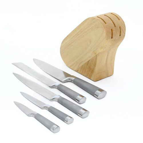 This 5-piece knife set features high-manganese carbon steel blades, including essential tools like a chef’s knife and bread knife, accompanied by a stylish wooden storage stand for organized kitchen efficiency.