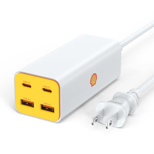 This Shell 100W 4-port fast charger, utilizing GaN III technology, offers efficient, high-speed (PD3.0/QC4+) charging for laptops, tablets, and smartphones simultaneously.